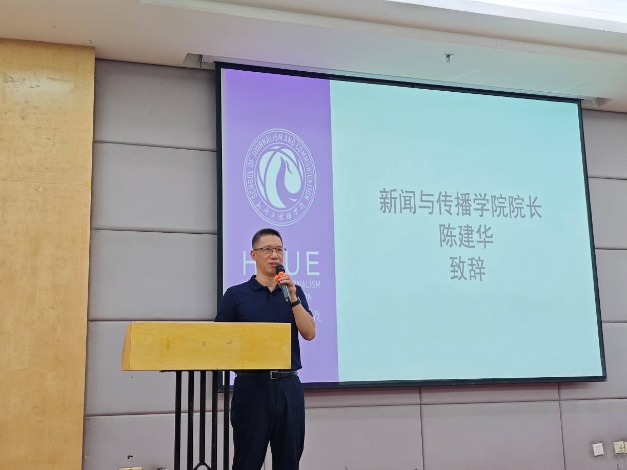 学院院长陈建华代表学院对2025级新生的到来表示热烈欢迎,并指出,当今社会日新月异,新闻传播学科发展变化迅速,潜力无限。同学们要增强信心,认清自我,和老师们一起成长为师生共同体,精神共同体,文化共同体。他希望同学们做到:养成读书习惯,不断开拓精神视野;加强体育锻炼,锻造良好身体素质;做到知行合一,练就扎实专业本领;在新闻与传播学院开启精彩的人生新篇章。