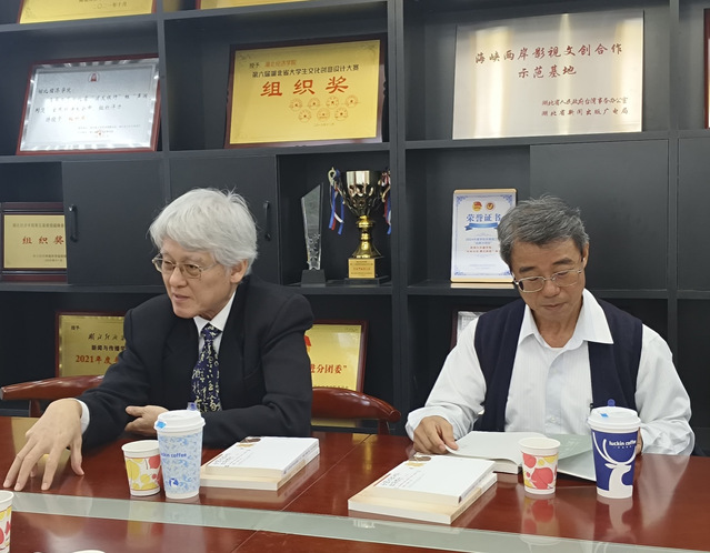 双方还就中华优秀传统文化教育展开了讨论。专家们提到,台湾中小学将书法、古诗文及“儿童读经”纳入课程,社区亦开设有“四书五经”研习班,实现对儒家思想的传承。同时,以《论语》为核心框架,兼容现代作家作品及外国文学改编内容,通过书法篆刻比赛、书院教育等形式强化实践。高校长特别强调,台湾教育注重将“琴棋书画香花茶道”等“六艺”融入生活,推动礼仪习俗的社会化传承。曾浪老师认为,这种“生活艺术化”的实践,正是对“伦理的生活化、生活的艺术化”的最好践行,为传统文化的现代传播提供了重要启示。双方认为,两岸对中华优秀传统文化的弘扬高度一致。最后,中文系教师向专家赠送自编《大学语文》等教材进行切磋交流。