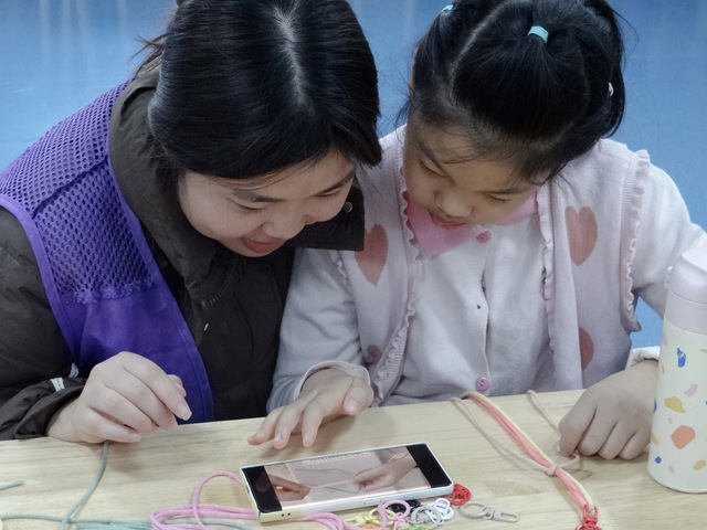 活动开始,志愿者与社区儿童结对入座,共同观看编绳技艺专题教学片。视频系统展示了中国编绳艺术花花挂件的制作流程。在实践教学环节,志愿者们采取分组指导、循序渐进的教学模式,从固定线头、交叉缠绕到均匀拉紧,耐心细致地进行一对一辅导。这种教学模式既体现了非遗传承的严谨性,又展现了志愿服务的温度,让参与者在动手实践中感受传统文化的魅力。